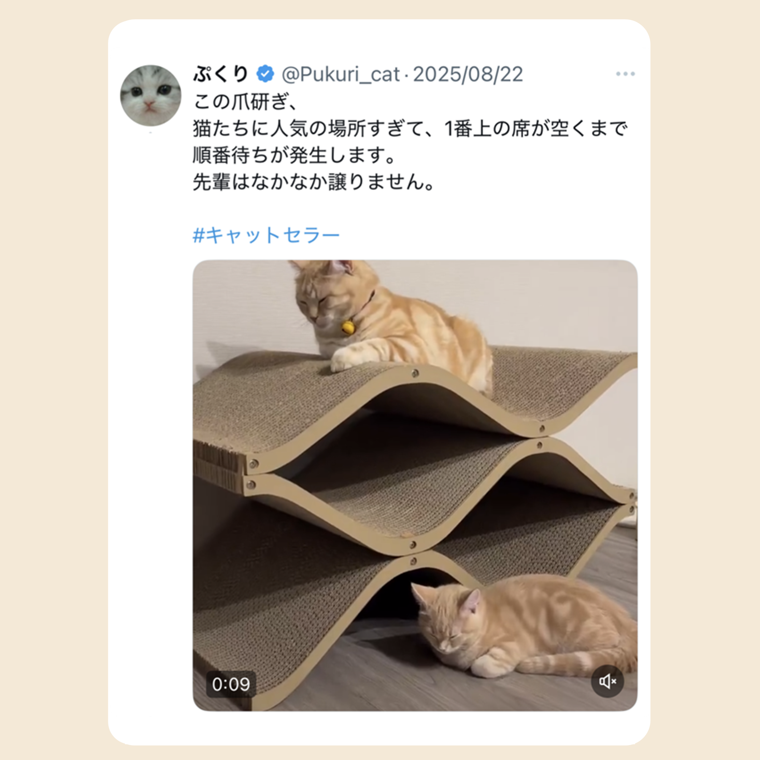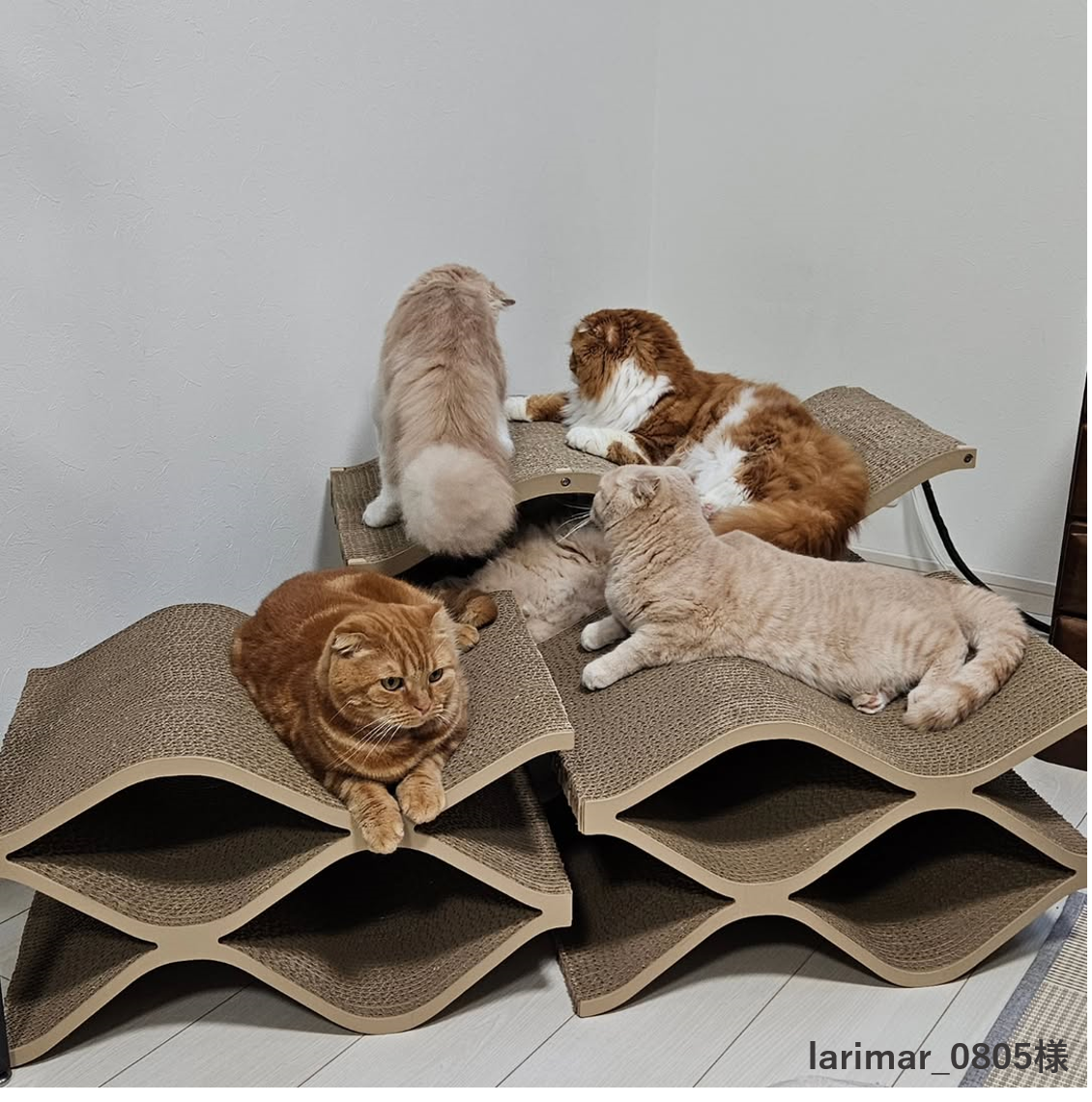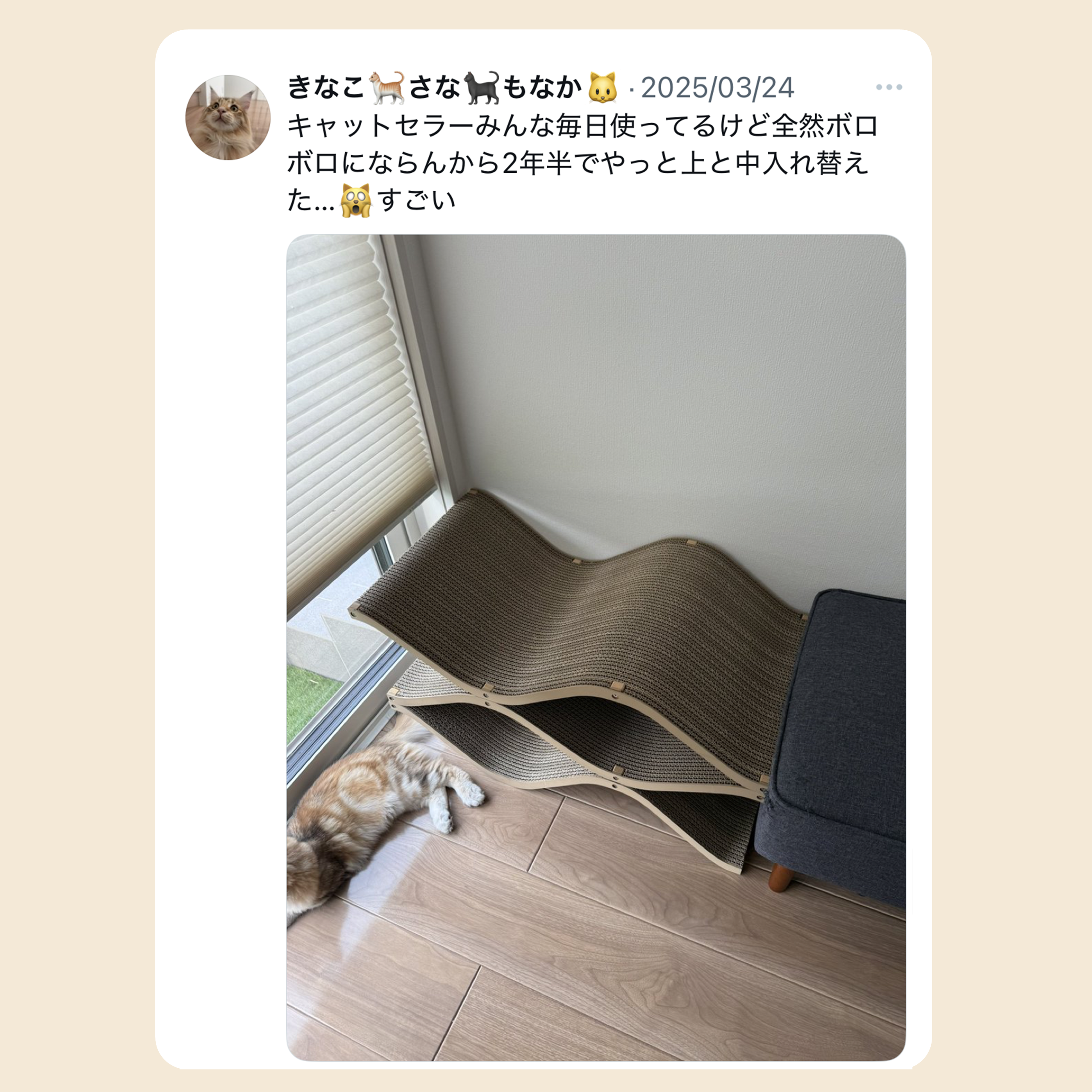 楽しみに待っていた爪とぎが昨日届きました❣️シャルも気に入ったようで早速爪とぎしていました。ちょうど良いカーブで今もくつろいでいます。デザインが本当に素敵で、オブジェのようでとっても気に入りました✨大切に使わせていただきます😊